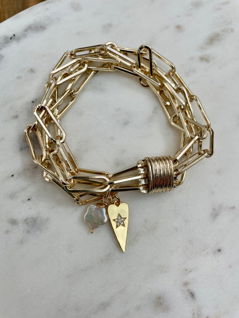 Hand-wired freshwater pearl and heart charms designed on our 4-strand Gold Link Bracelet