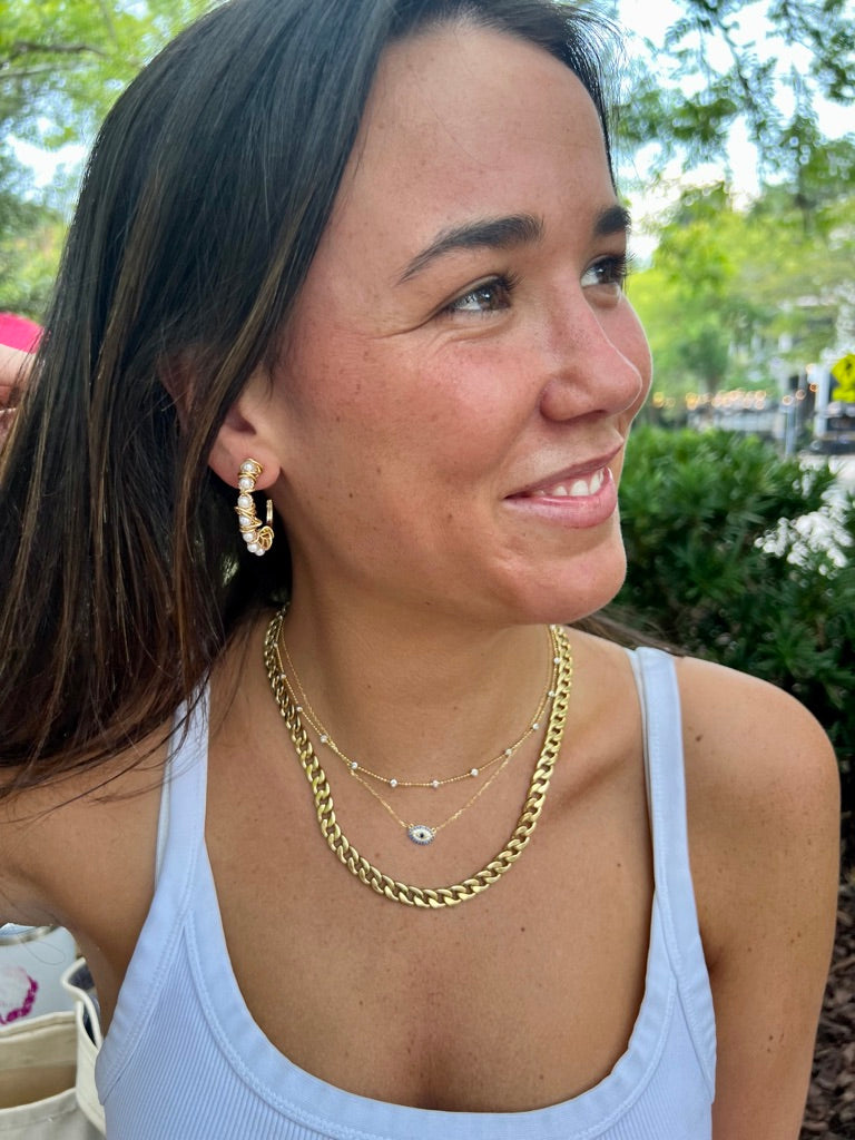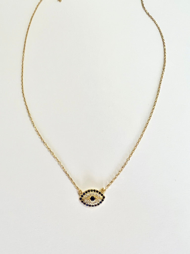 • The Gold Evil Eye modeled here with our Moon-cut and Monaco necklaces