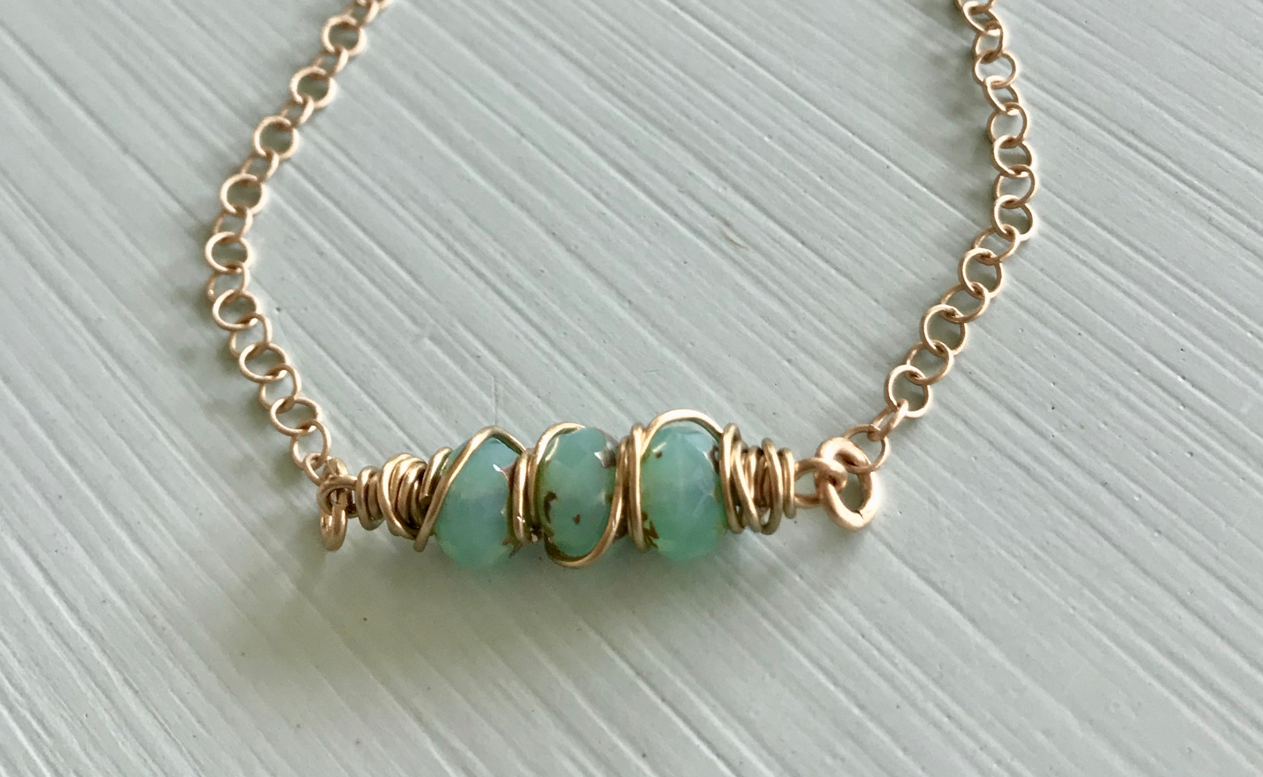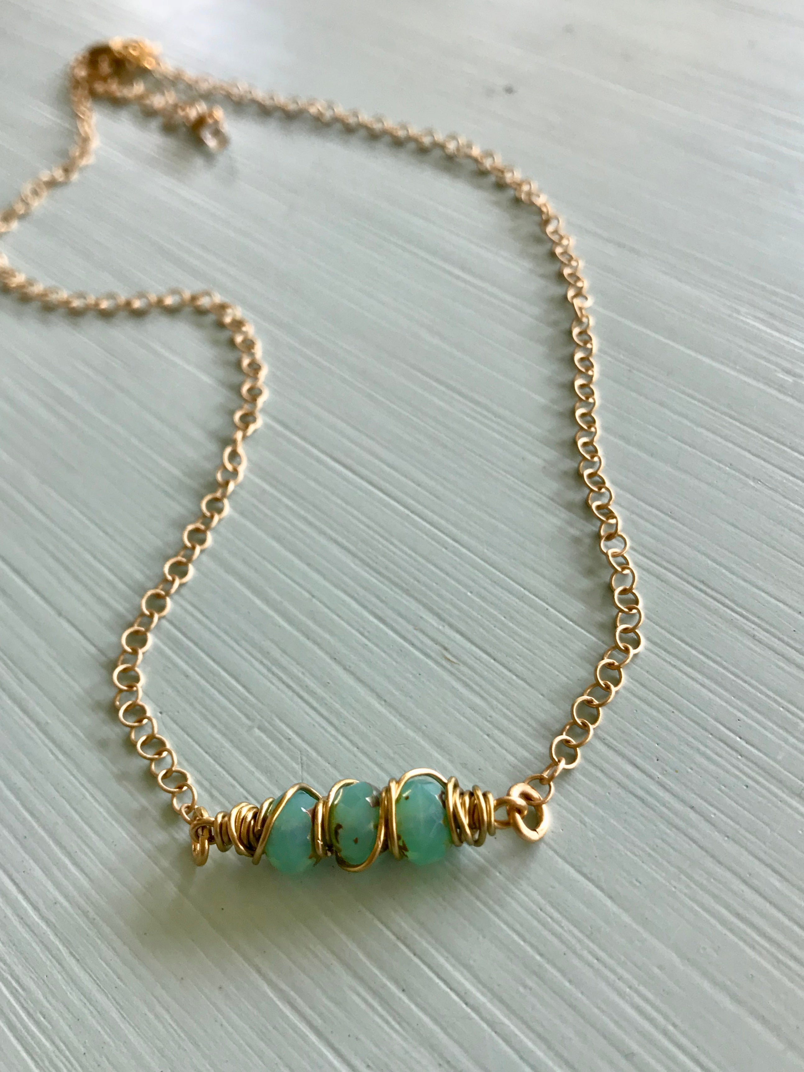 • Hand-wrapped fire-glazed sea foam glass in the perfect shade of blue-green on 15" heavily plated quality gold chain, adjustable to 18"