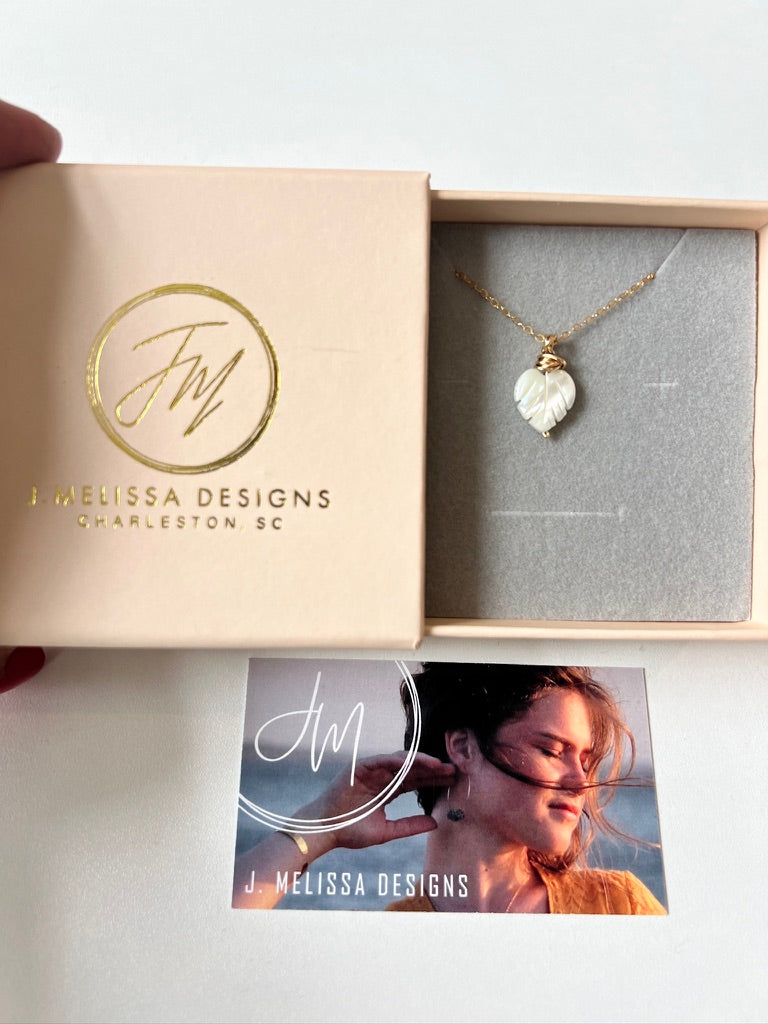 Carved Mother of Pearl leaf heart wrapped in 14 karat gold-filled wire